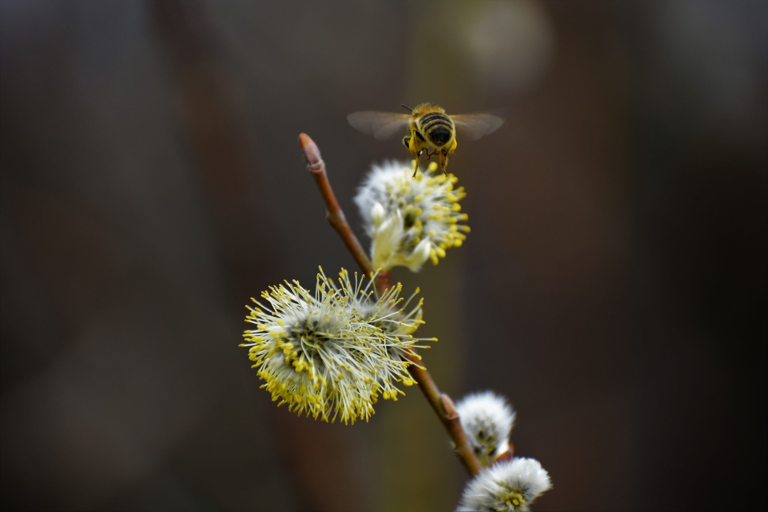 Honigbiene fliegt zur Sal-Weide (gelber Frühblüher)