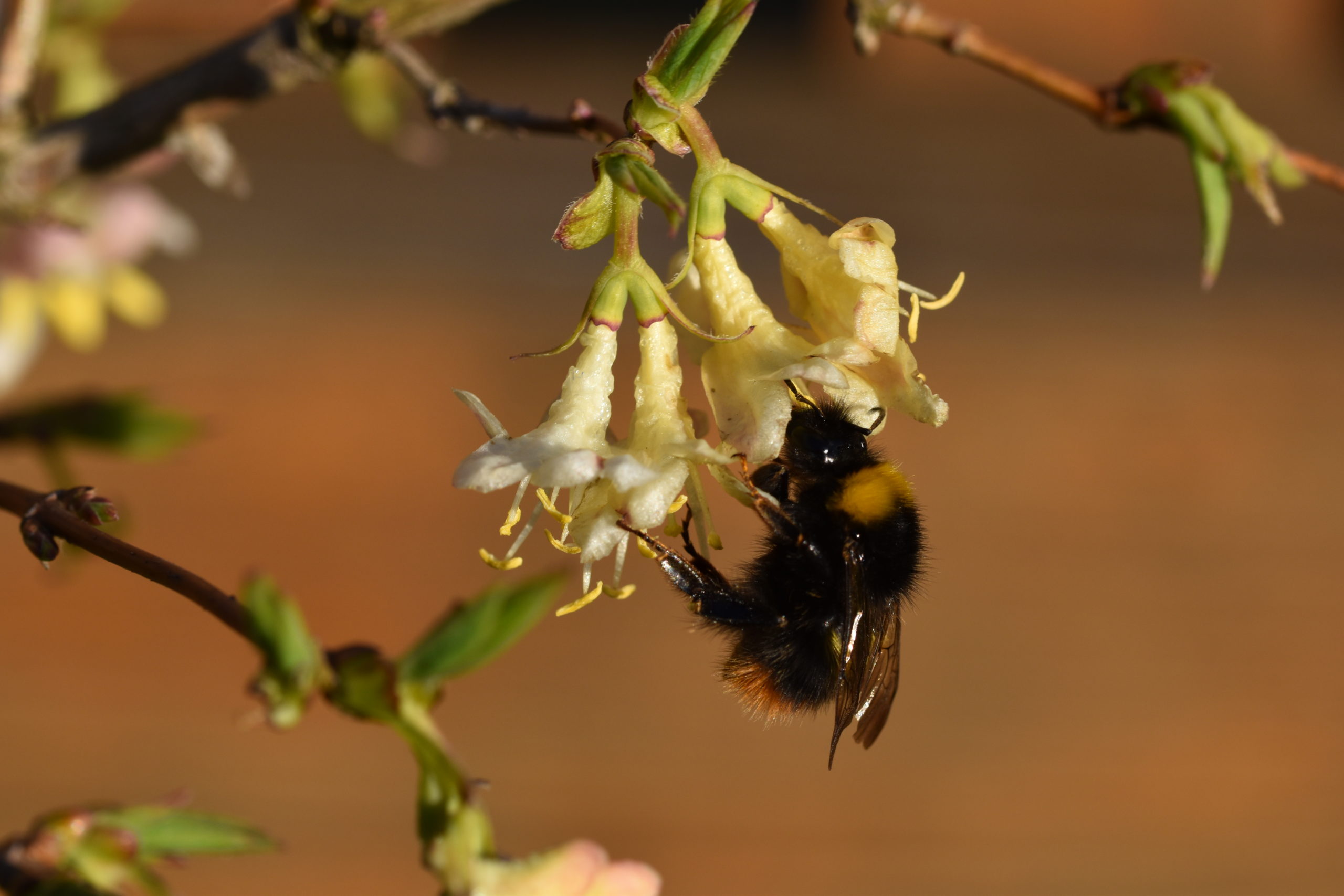 Winterblüher Heckenkirsche - Blütenbesuch einer Hummelkönigin